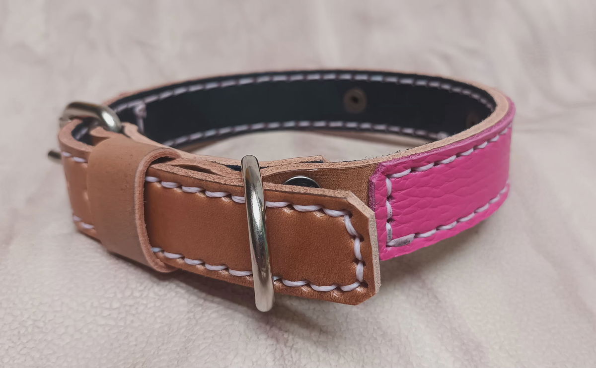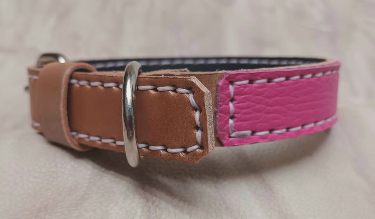 El Collar Yana es la mezcla perfecta de elegancia y comodidad para tu perro. Hecho a mano con cuero curtido vegetal, este collar no solo es resistente, sino que también se adapta a la perfección a la piel de tu peludo. Lo que lo hace único es su detalle en cuero rosa cosido a mano, que le da un toque de estilo sutil pero llamativo.
