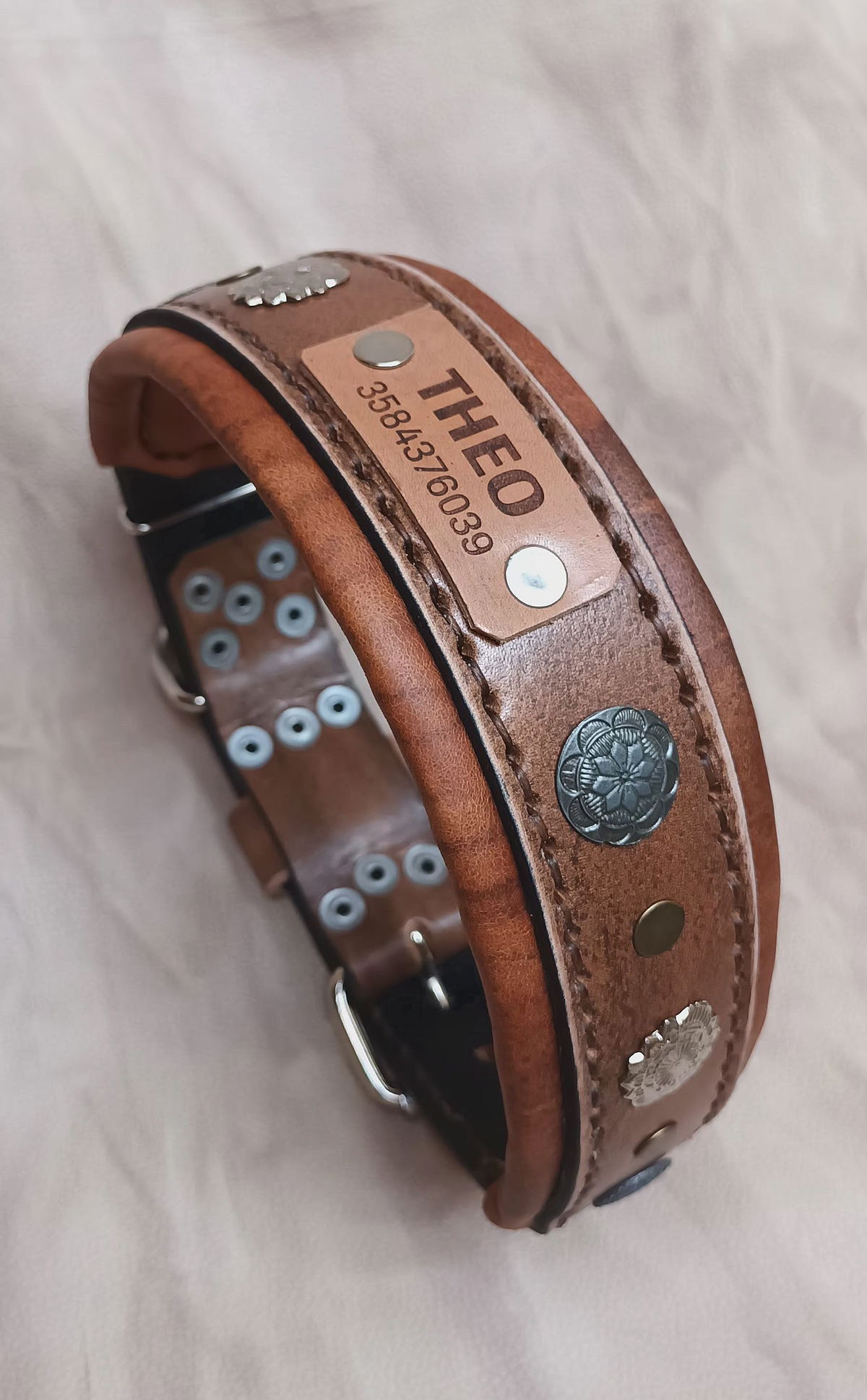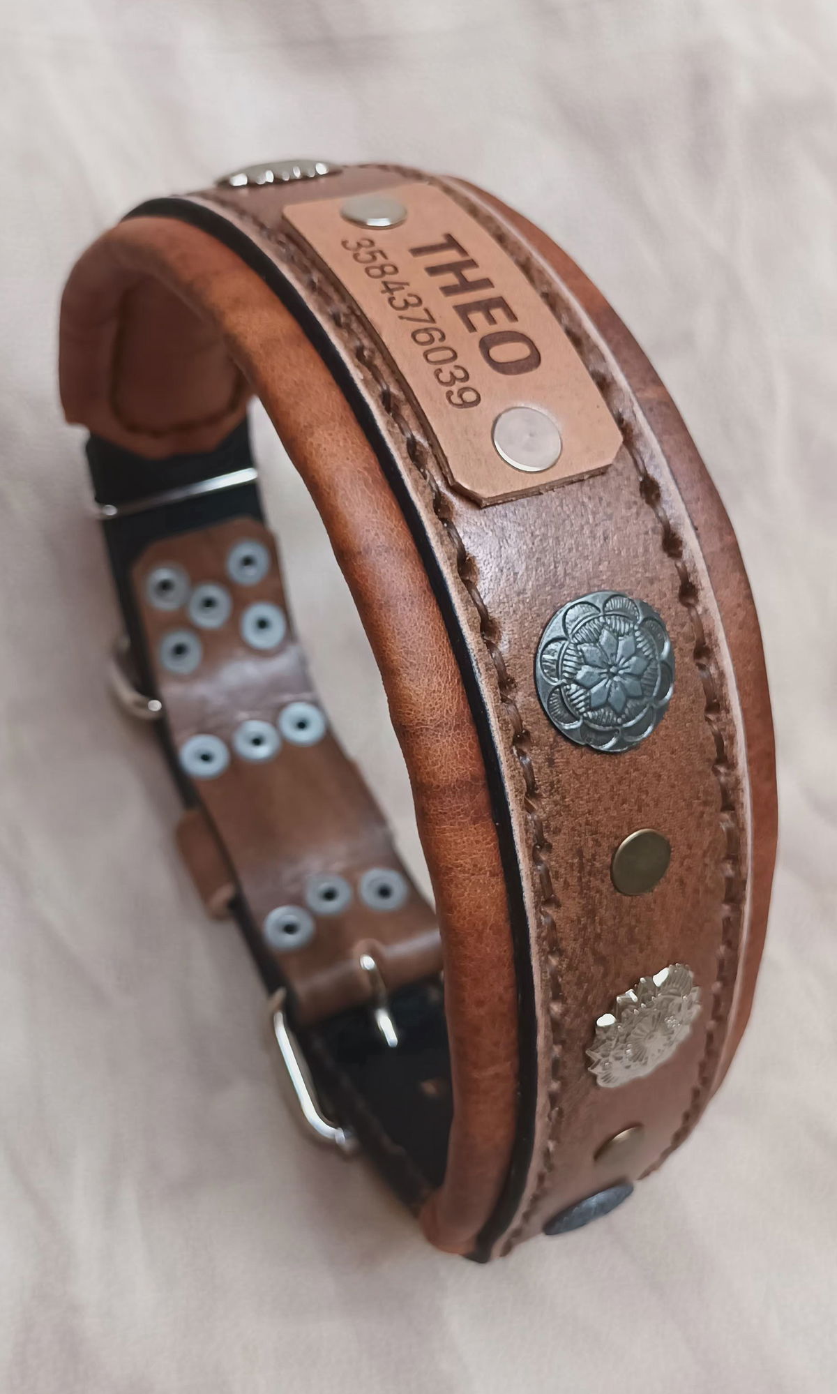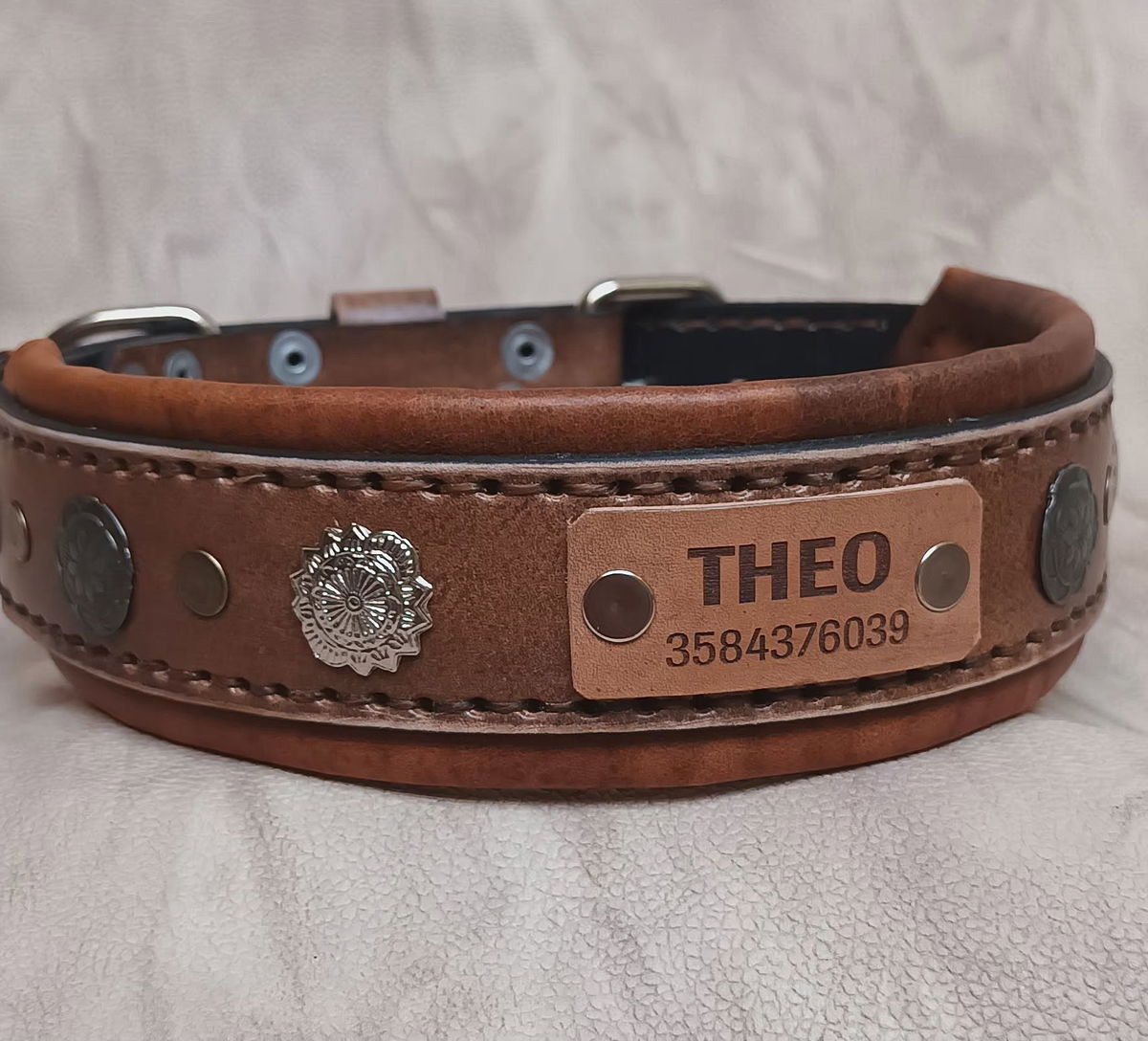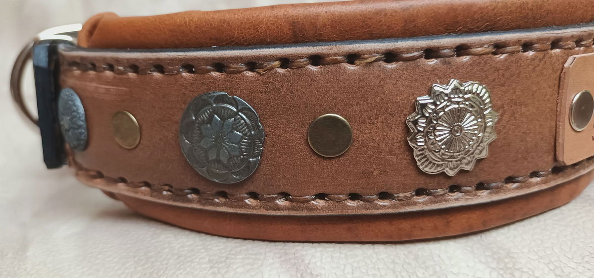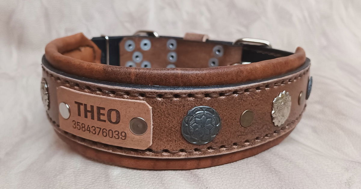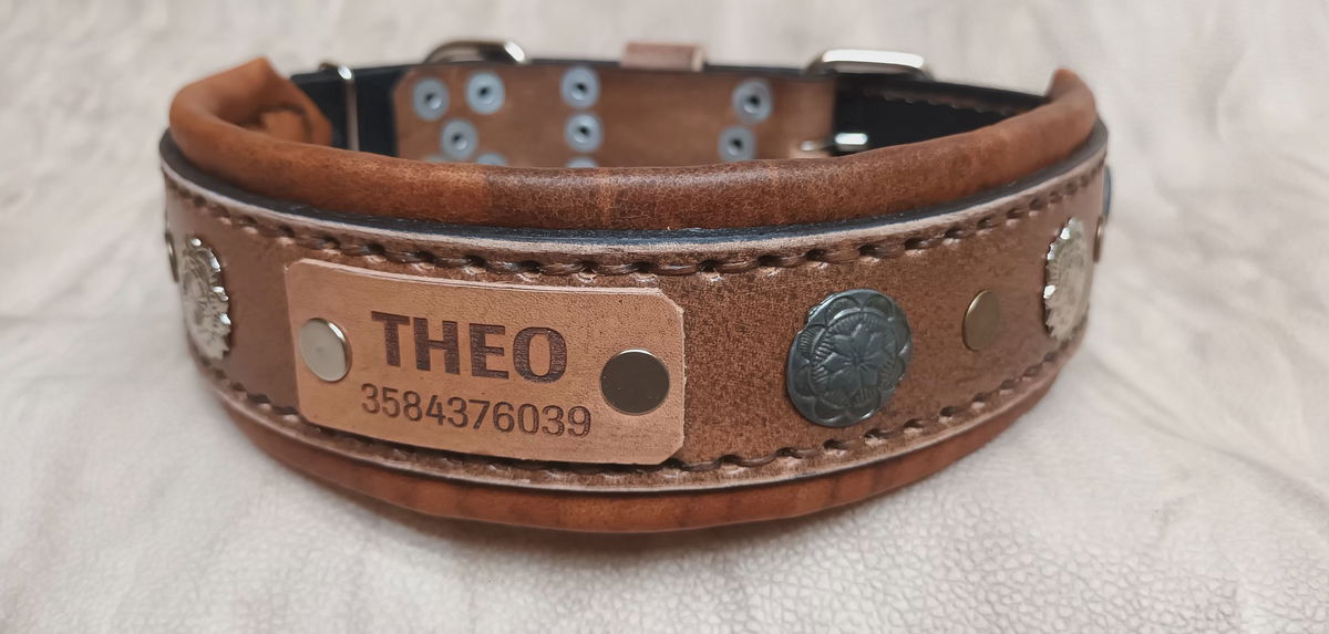 Equipado con herrajes metálicos reforzados para máxima seguridad y una placa de identificación incorporada, este collar no solo destaca por su estética imponente, sino también por su funcionalidad. Ideal para perros de carácter fuerte y guardianes por naturaleza, el Collar "Rakas" es una declaración de estilo y poder.