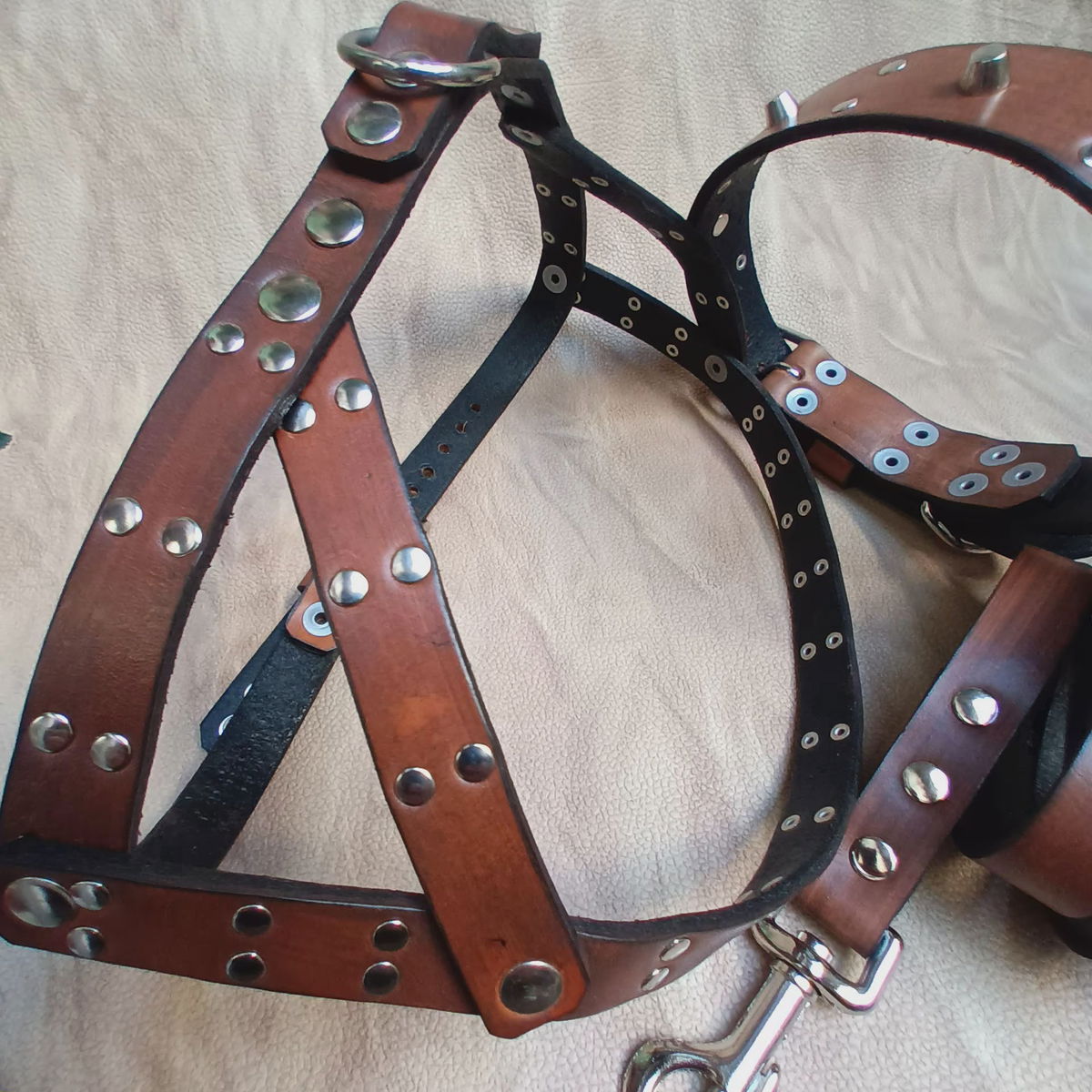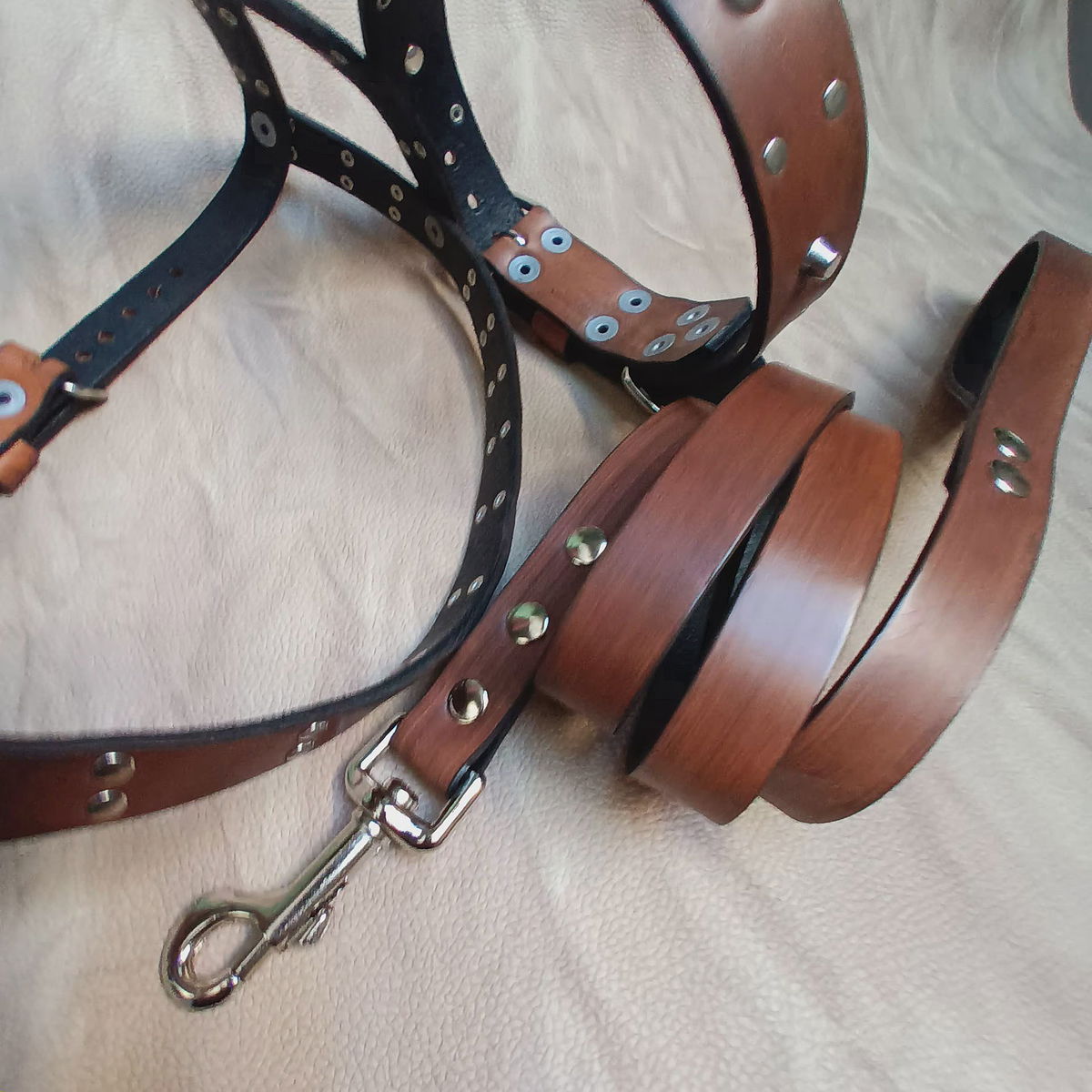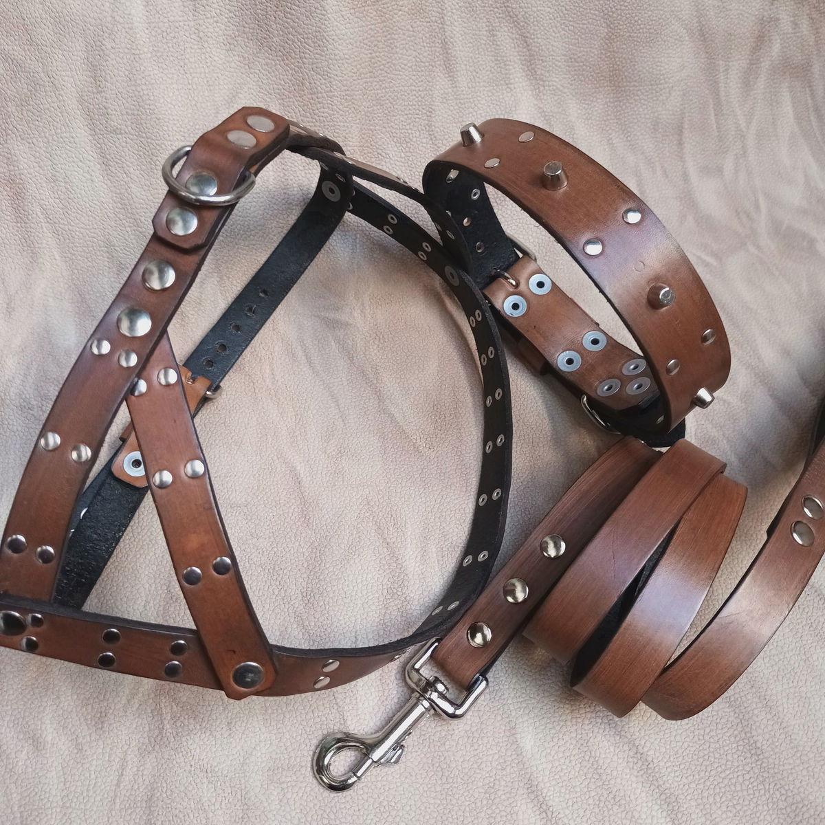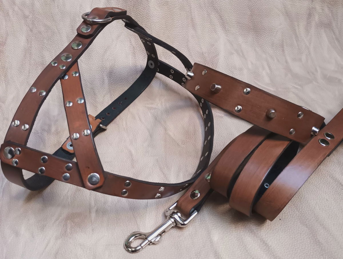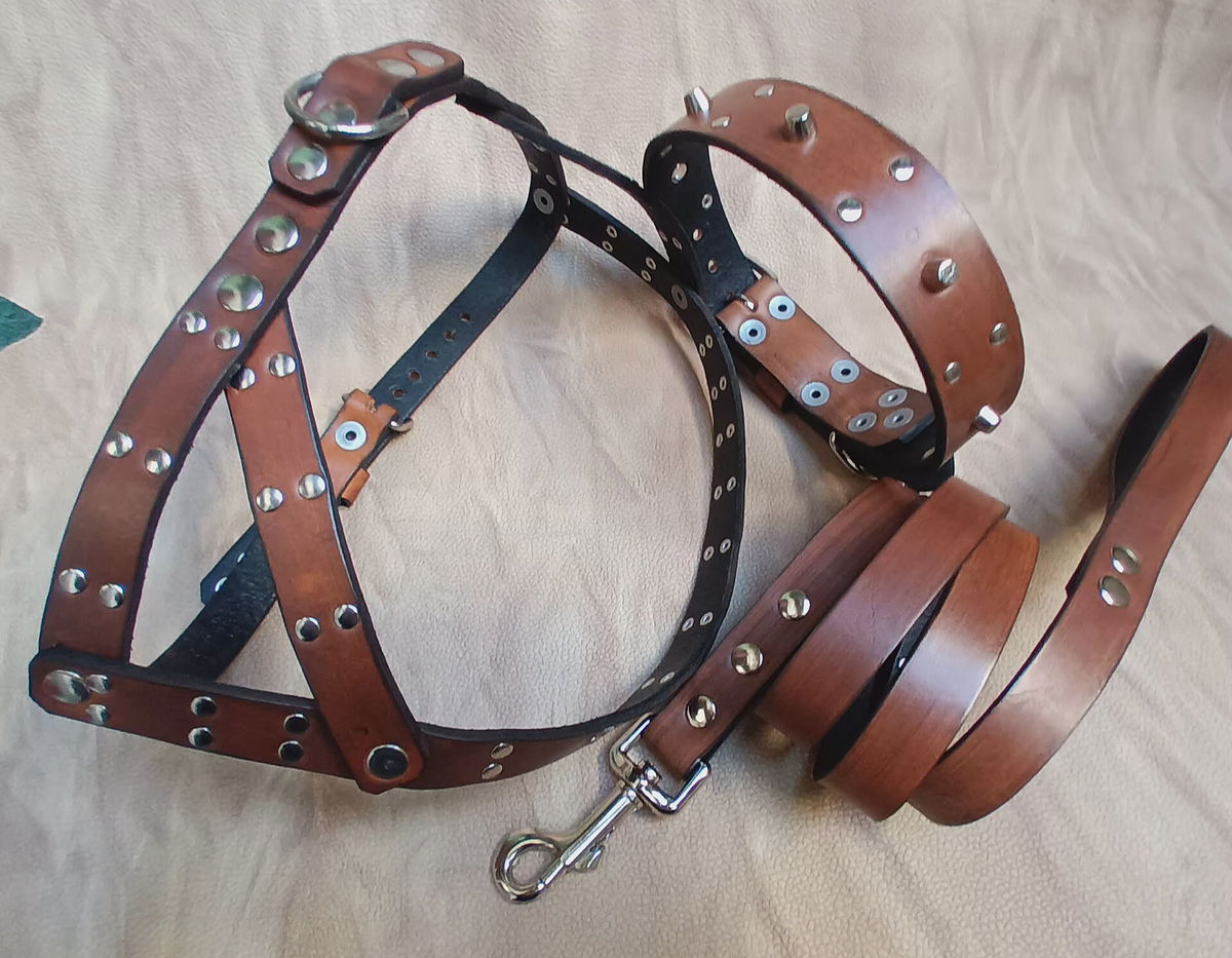 Set de paseo completo a medida para perros de tamaño mediano con remaches tipo cónicos en relieve y redonditos herrajes reforzados y soldados.