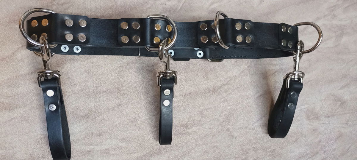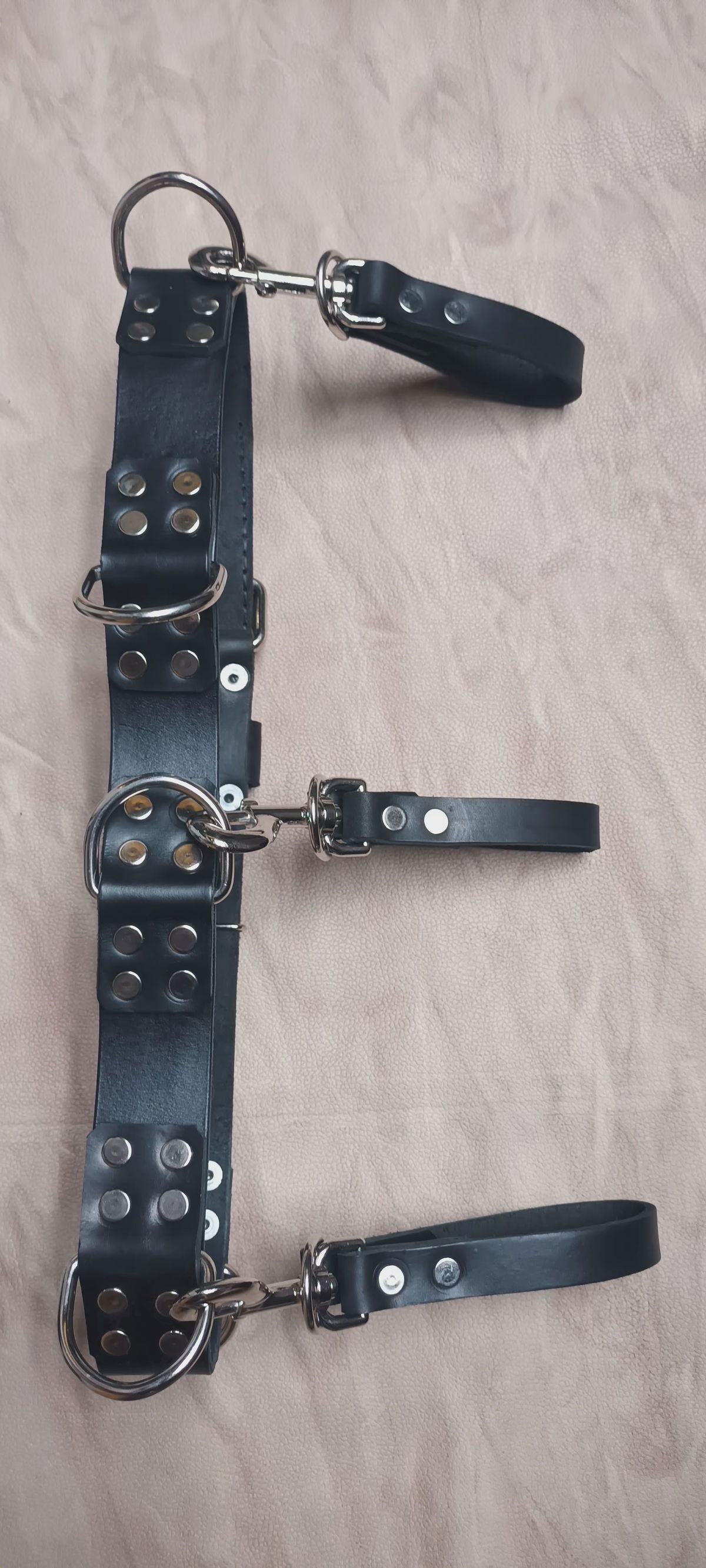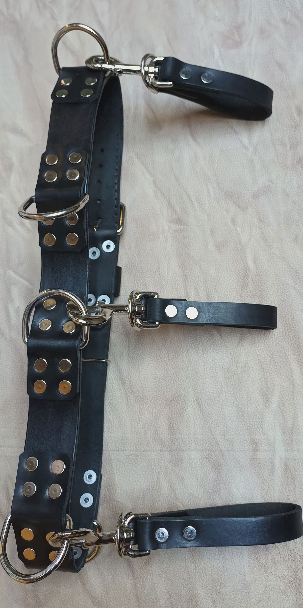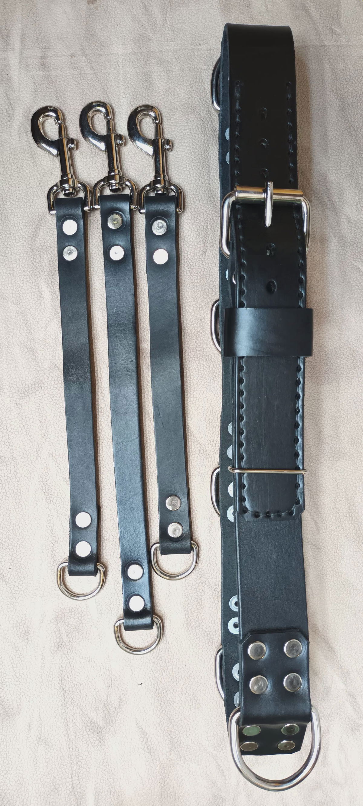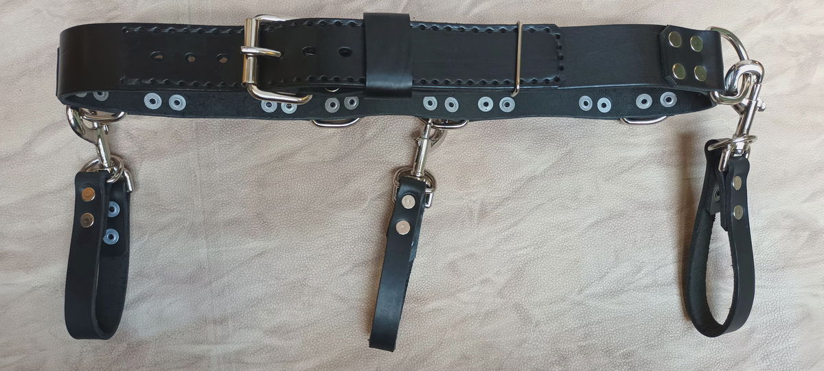 Vas con manos libres, diseñado para quienes pasean varios perros a la vez, este cinturón está hecho en cuero curtido vegetal de alta calidad: resistente, flexible y duradero. Cuenta con cinco ganchos metálicos reforzados y soldados que permiten sujetar múltiples correas de forma segura y cómoda. Además, incluye tres manoplas con mosquetón reforzado, pensadas para adaptar las correas al cinturón según cada necesidad.