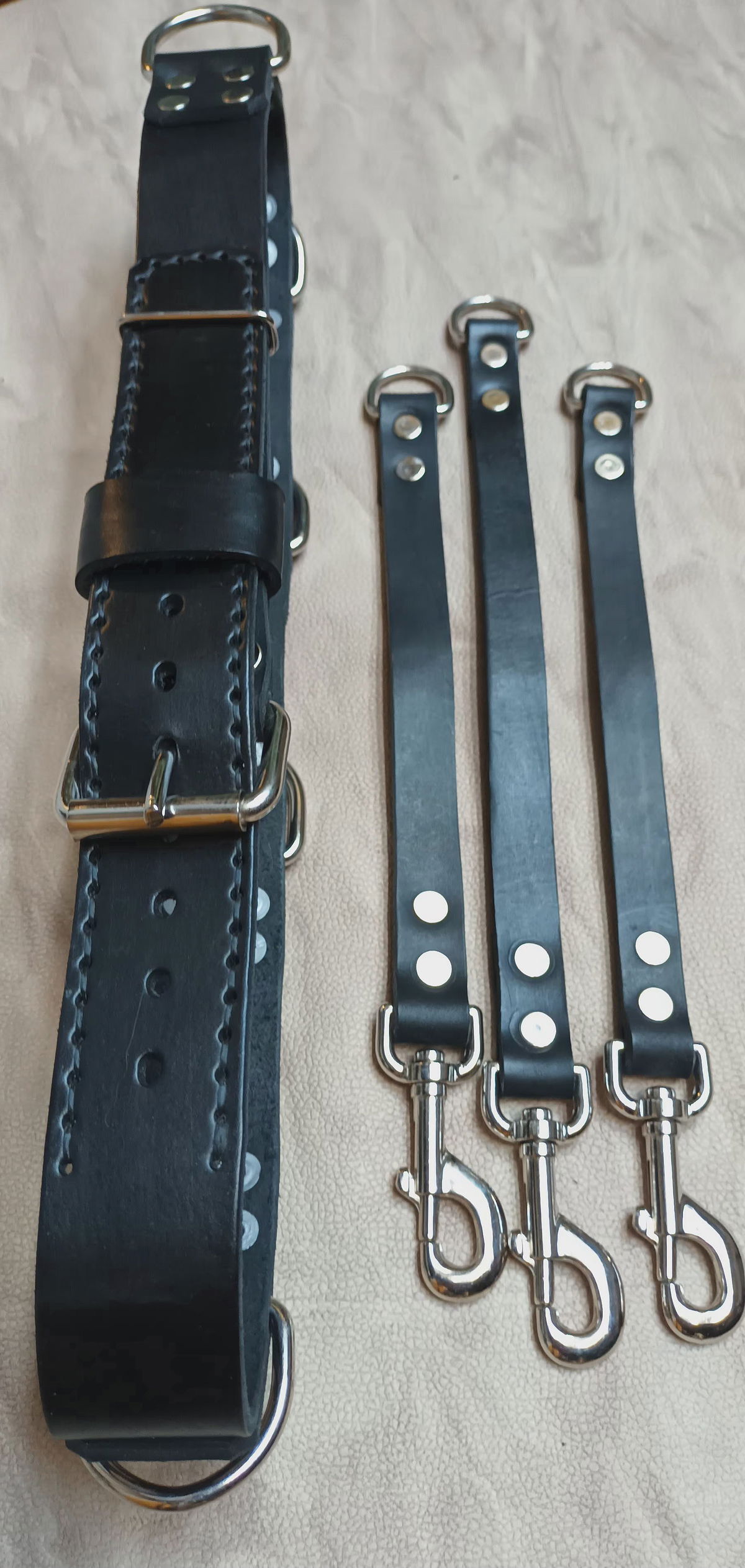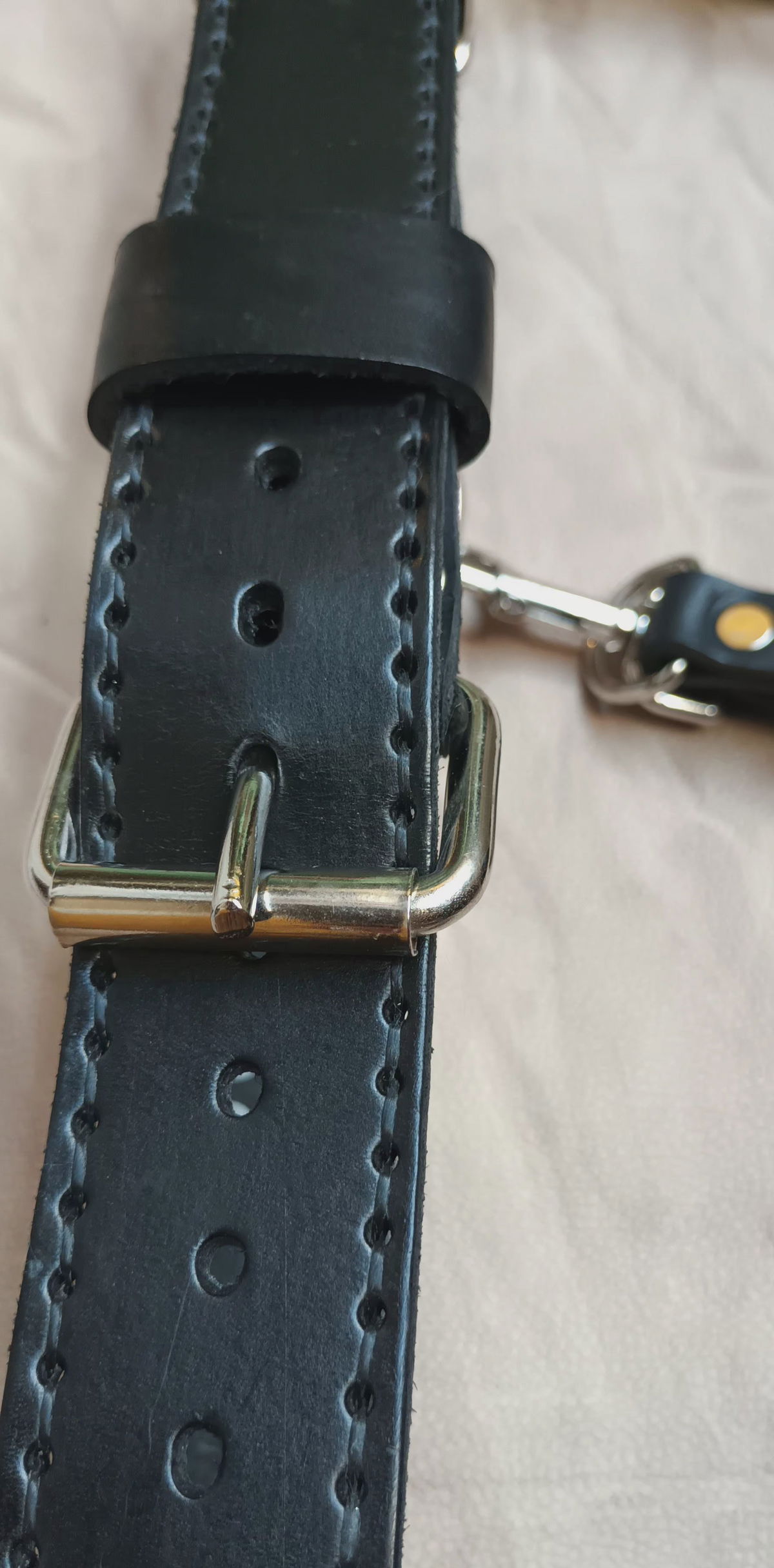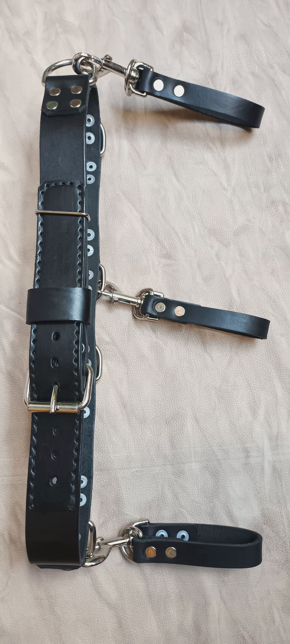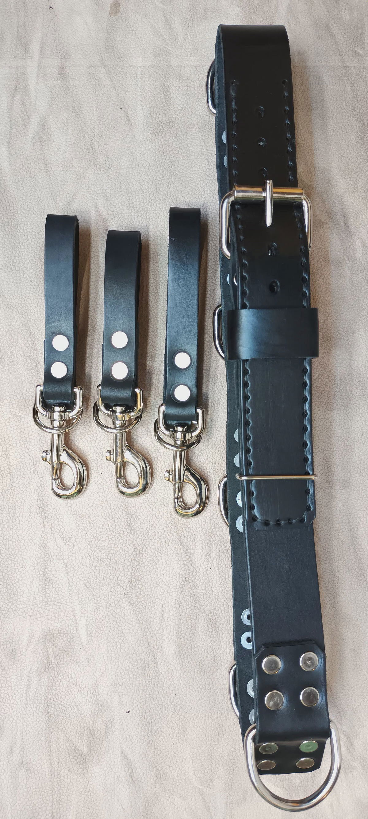 Vas con manos libres, diseñado para quienes pasean varios perros a la vez, este cinturón está hecho en cuero curtido vegetal de alta calidad: resistente, flexible y duradero. Cuenta con cinco ganchos metálicos reforzados y soldados que permiten sujetar múltiples correas de forma segura y cómoda. Además, incluye tres manoplas con mosquetón reforzado, pensadas para adaptar las correas al cinturón según cada necesidad.
