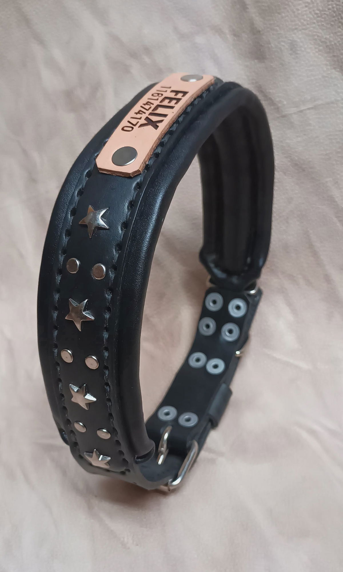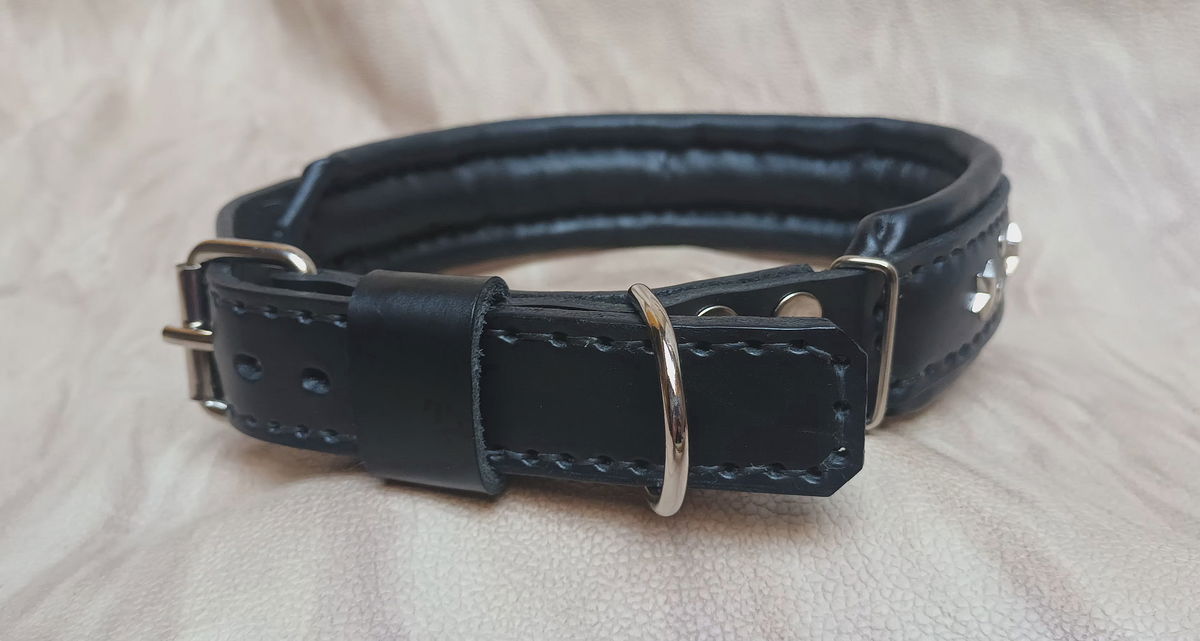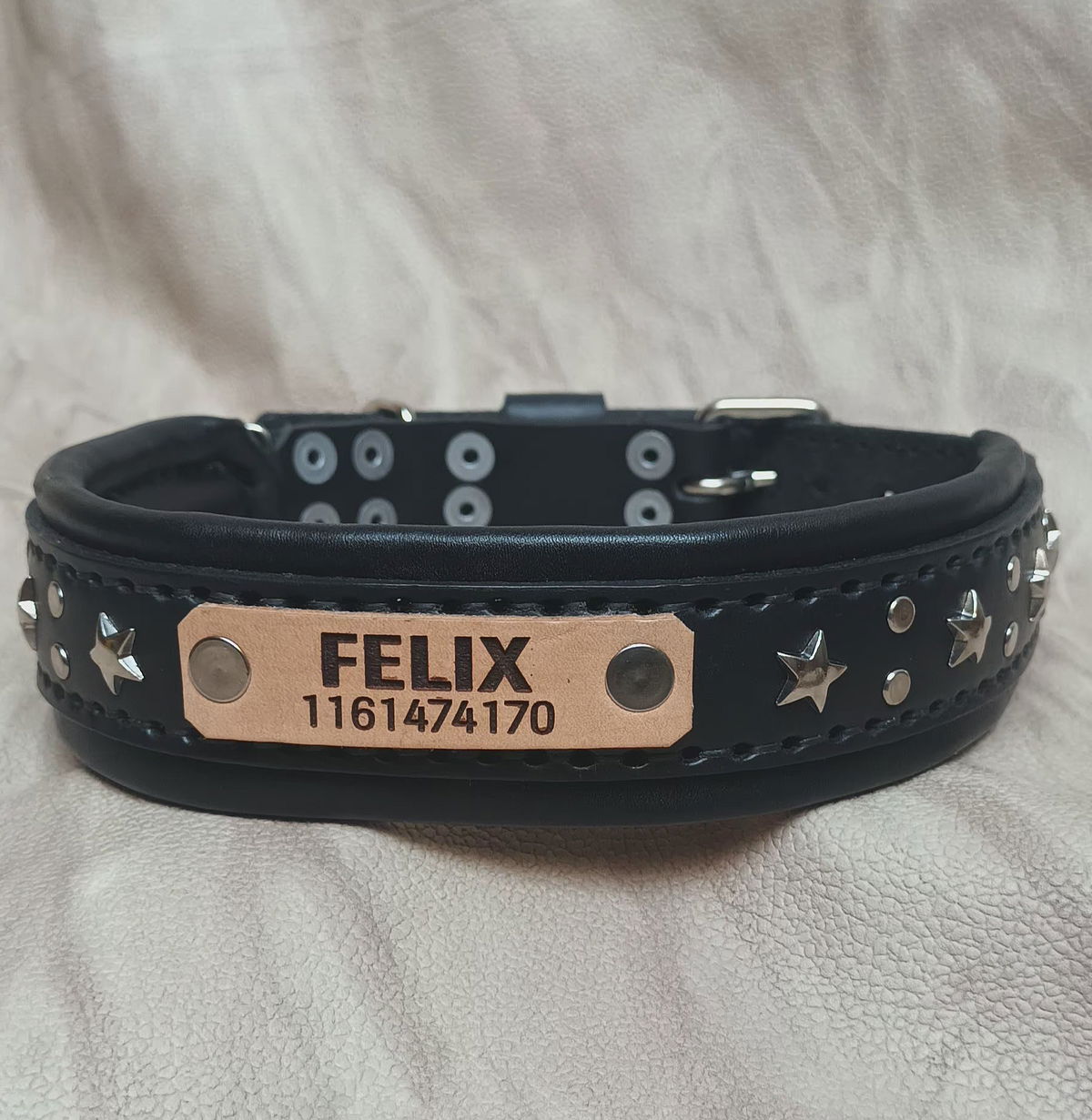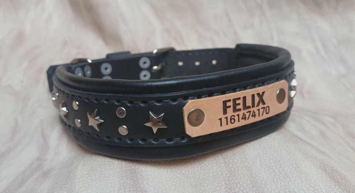 Este no es un collar, es EL collar. Hecho a mano con cuero legítimo doble acolchado para máxima comodidad y durabilidad, cosido con dedicación y rematado con estrellas metálicas que le dan ese toque canchero que tu perro se merece.