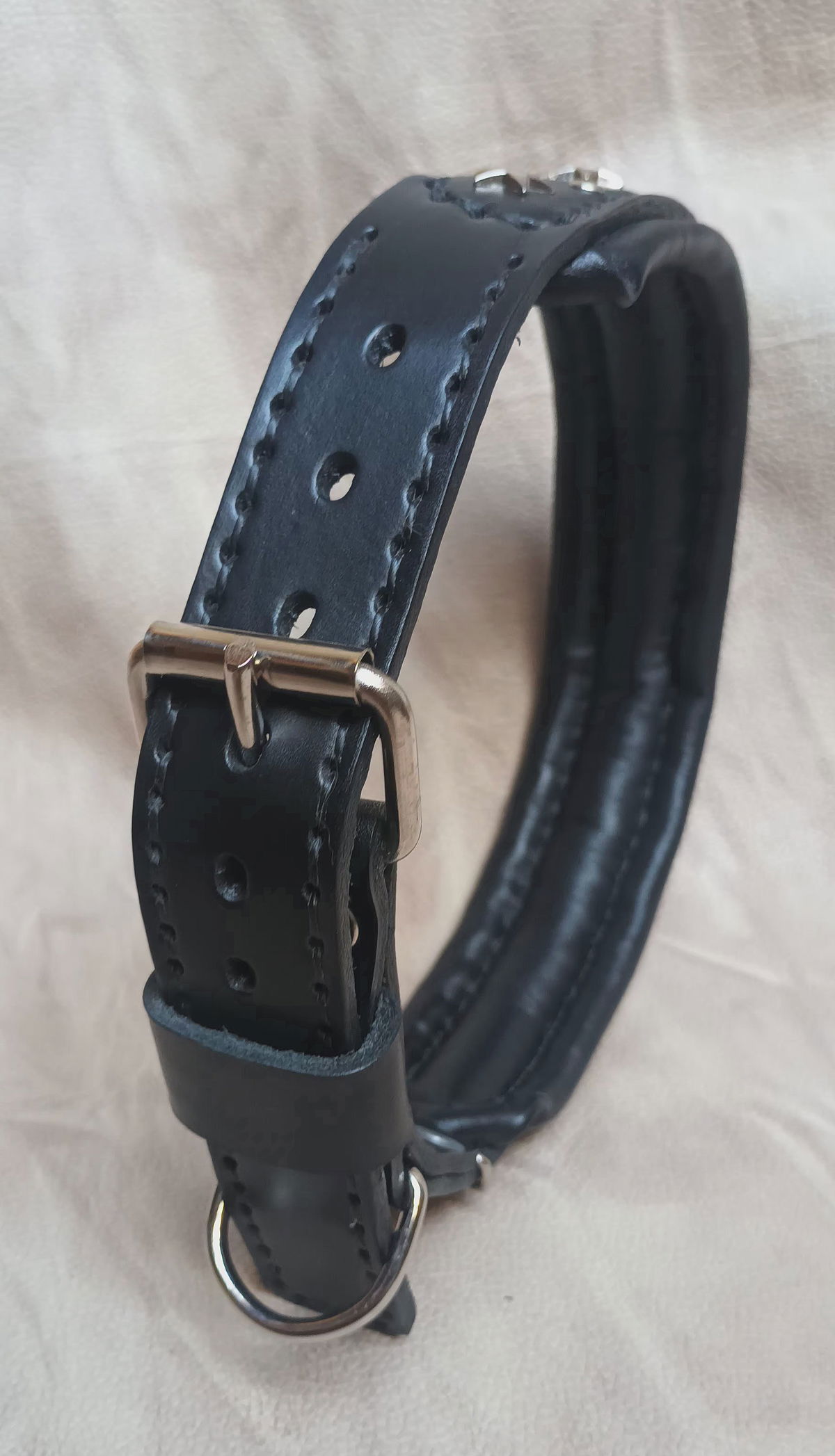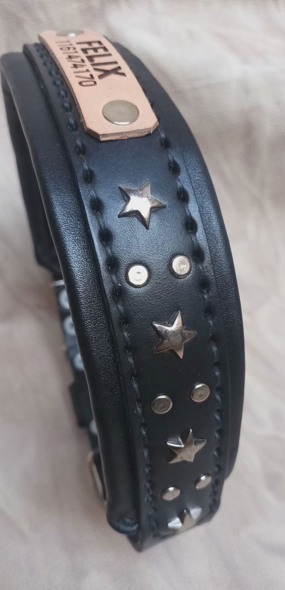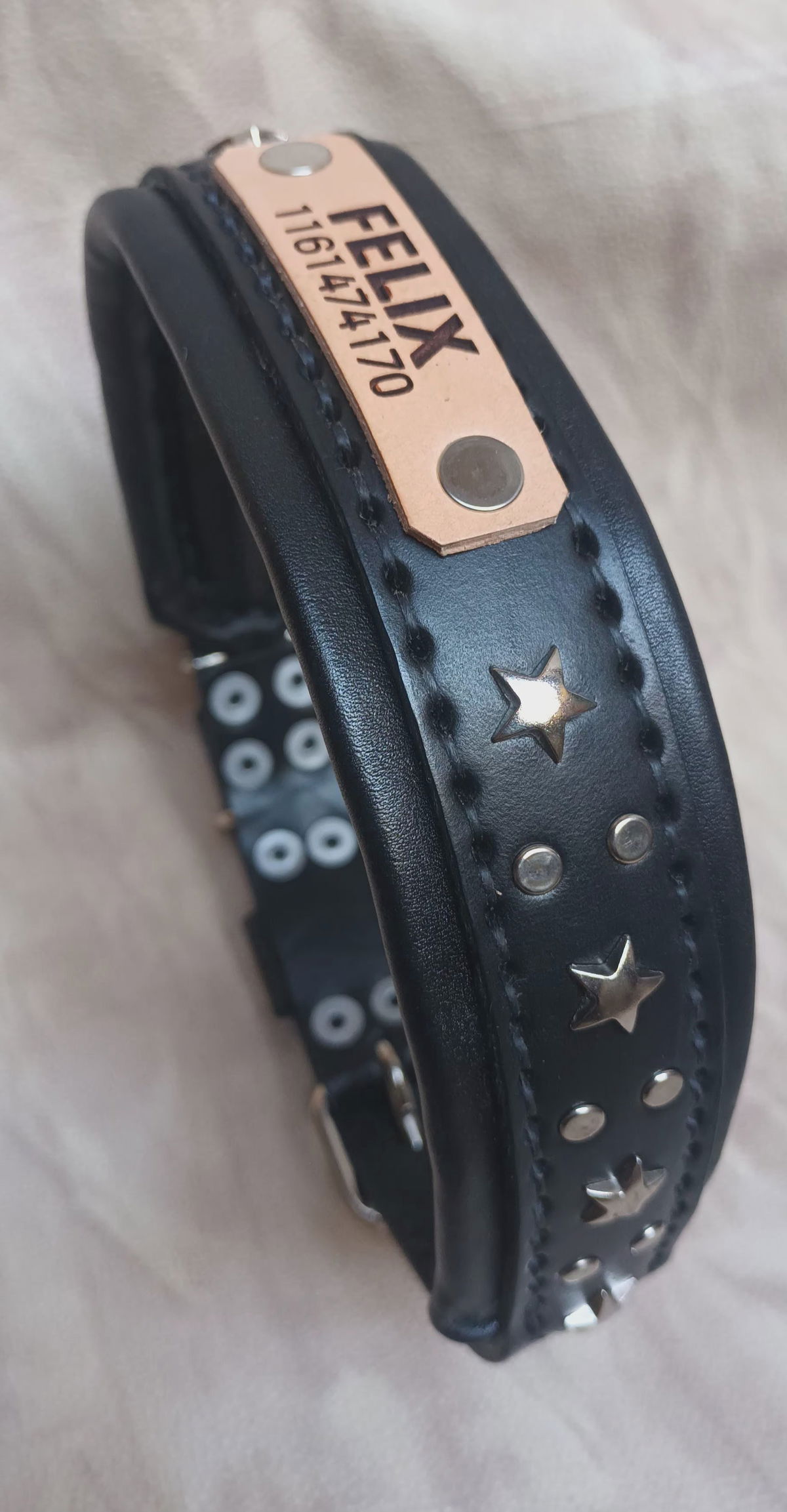 Este no es un collar, es EL collar. Hecho a mano con cuero legítimo doble acolchado para máxima comodidad y durabilidad, cosido con dedicación y rematado con estrellas metálicas que le dan ese toque canchero que tu perro se merece.