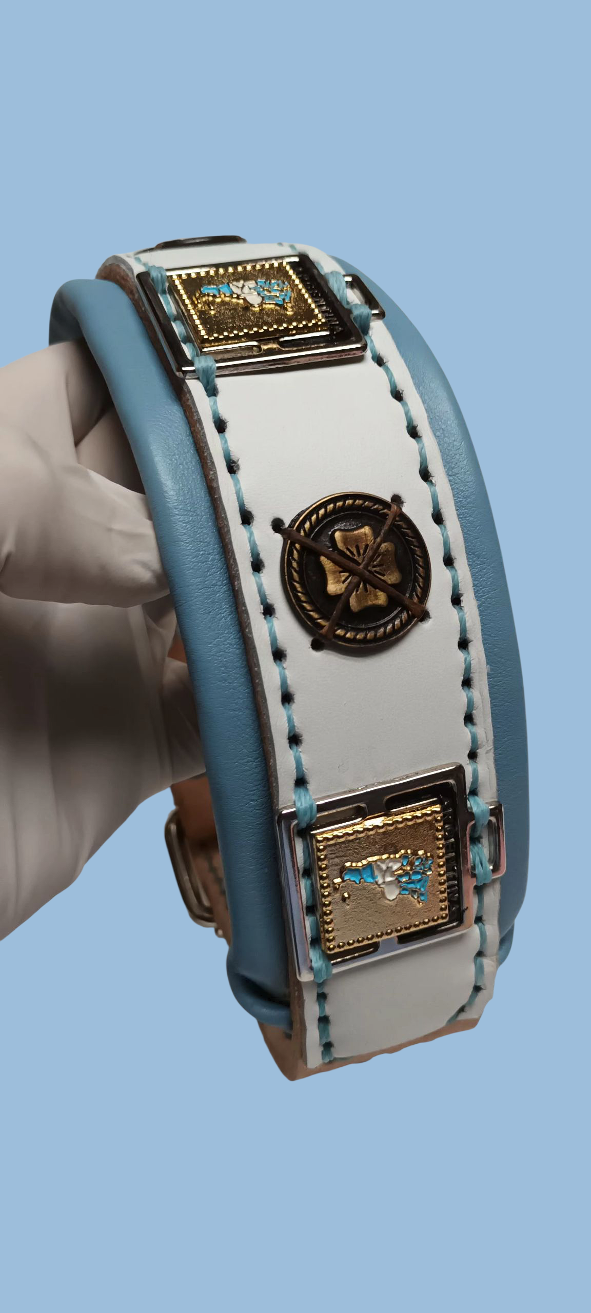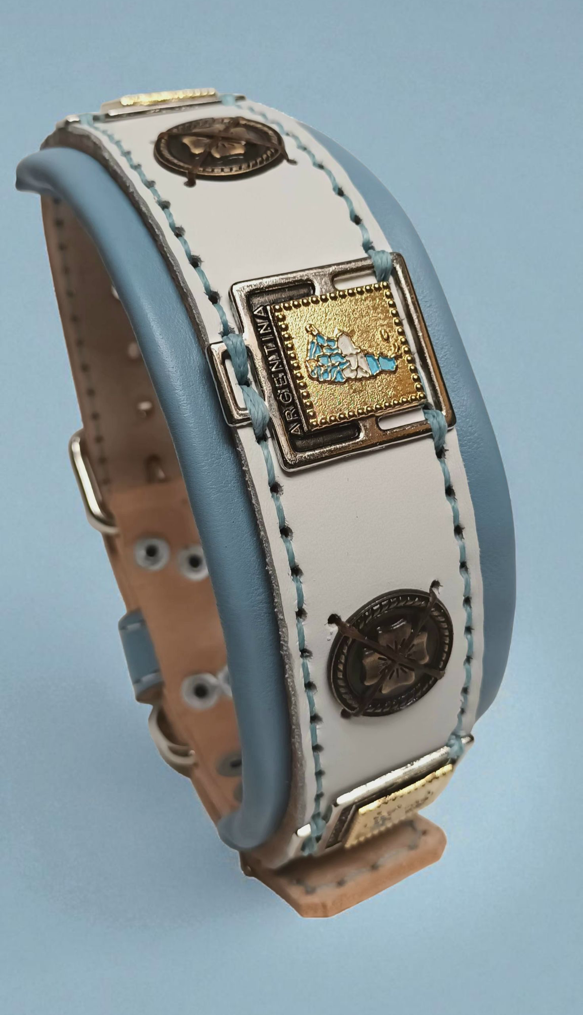 Este collar edición limitada está confeccionado con cuero triple cosido a mano, totalmente acolchado para máxima comodidad, y lleva herrajes metálicos exclusivos con el mapa argentino y emblemas autóctonos.