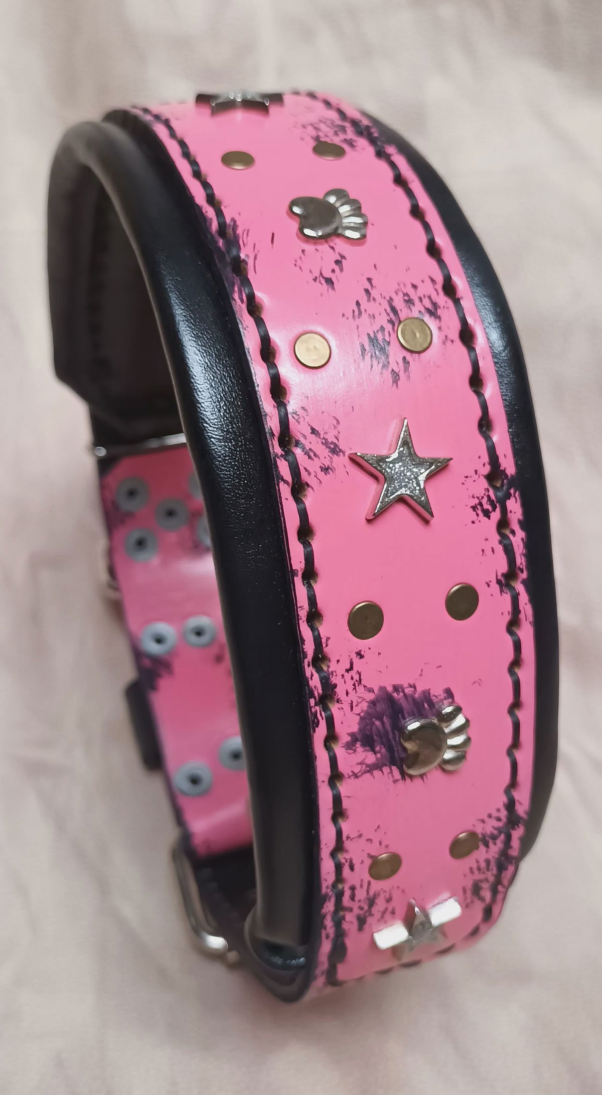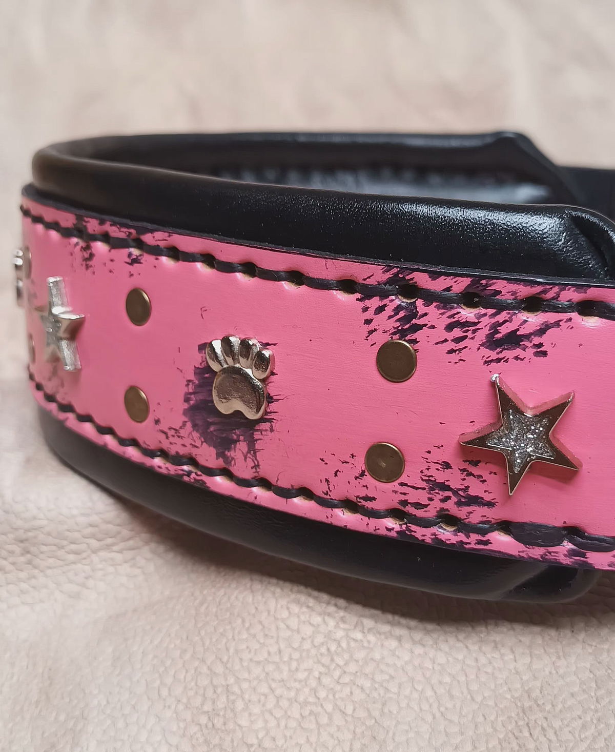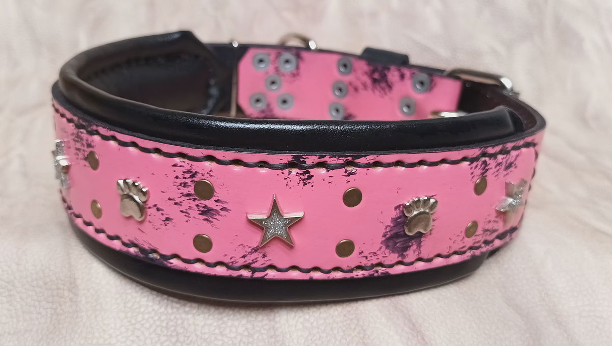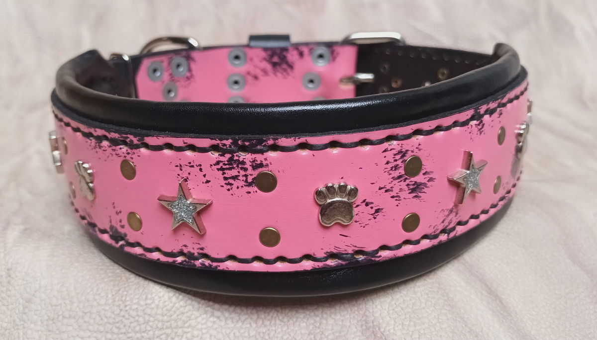 Diseñado para perros fuertes, alegres y con personalidad arrolladora. Este collar de cuero rosa manchado a mano con negro no pasa desapercibido. El interior es de cuero negro ultra suave para máxima comodidad. Los remaches con forma de huellas y estrellas brillantes suman ese toque de glam que lo hace único. Un diseño exclusivo, llamativo y con toda la actitud Khat.