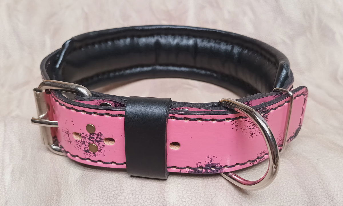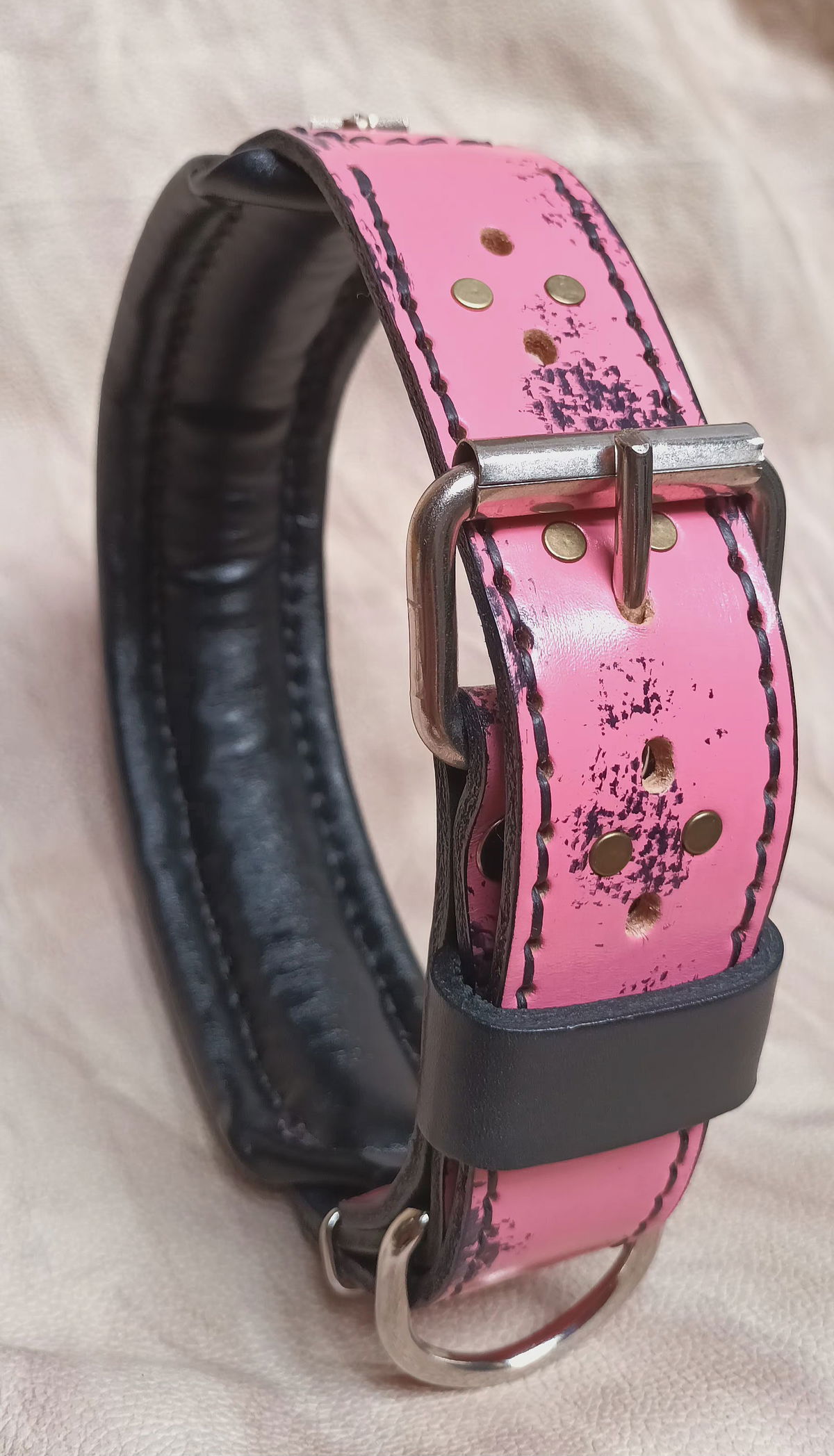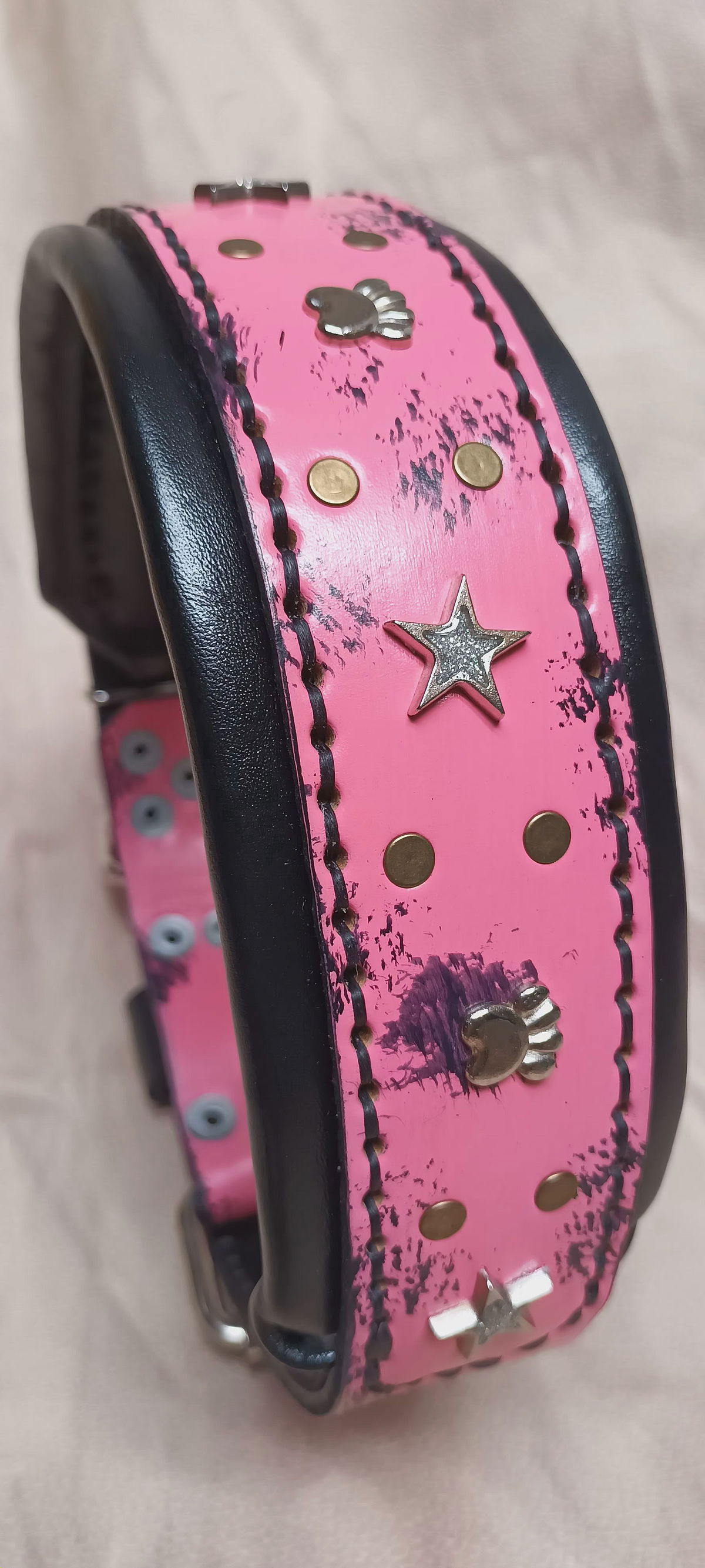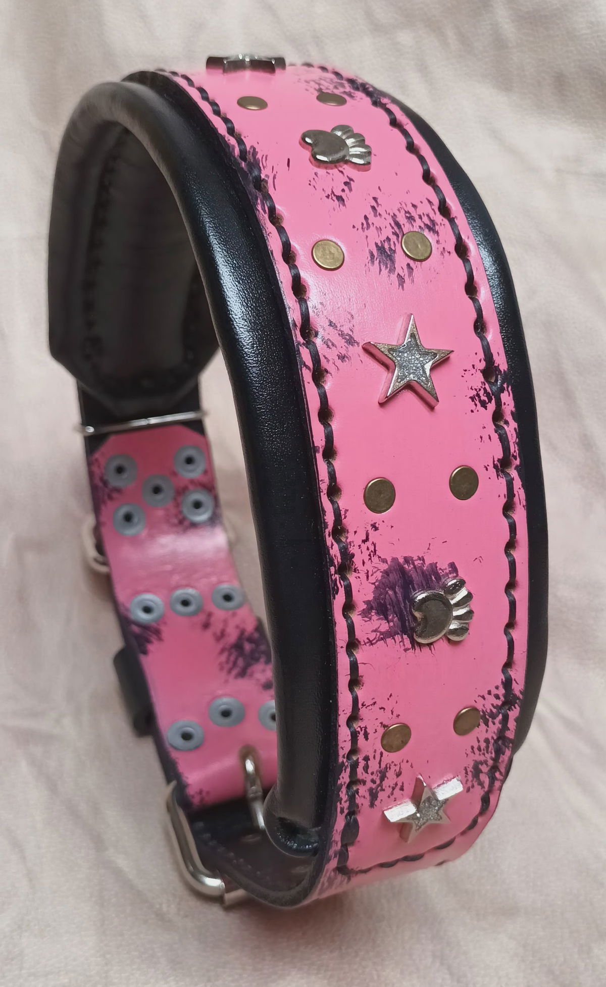 Diseñado para perros fuertes, alegres y con personalidad arrolladora. Este collar de cuero rosa manchado a mano con negro no pasa desapercibido. El interior es de cuero negro ultra suave para máxima comodidad. Los remaches con forma de huellas y estrellas brillantes suman ese toque de glam que lo hace único. Un diseño exclusivo, llamativo y con toda la actitud Khat.