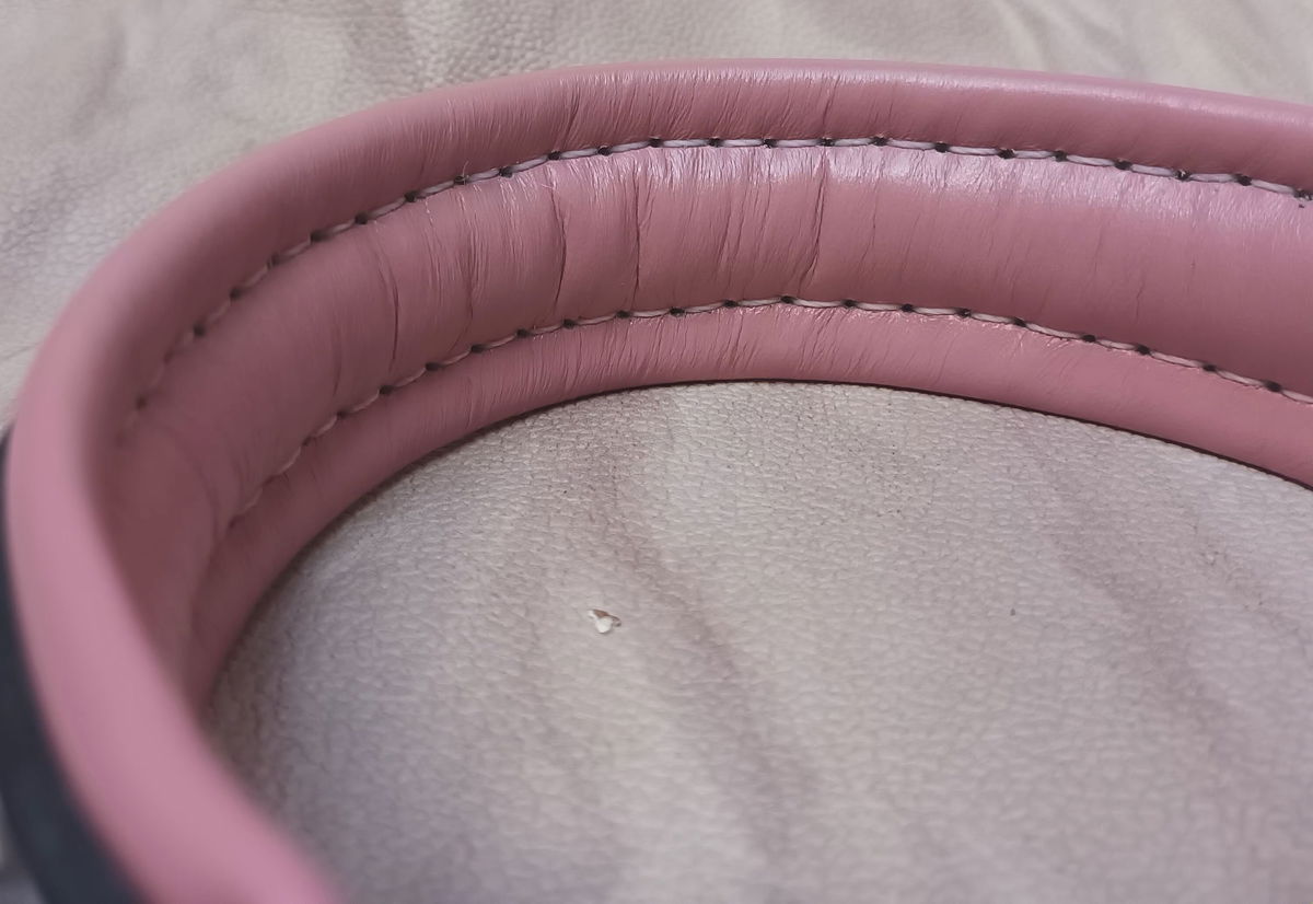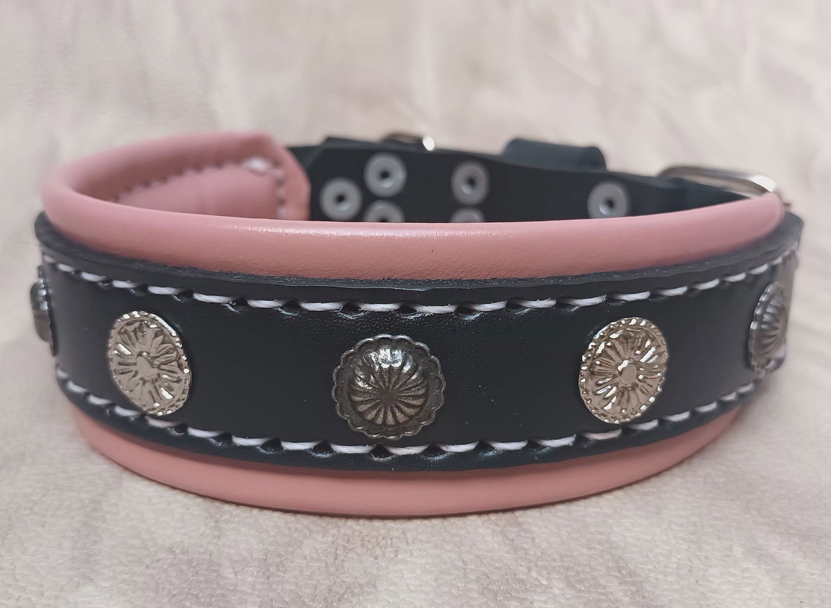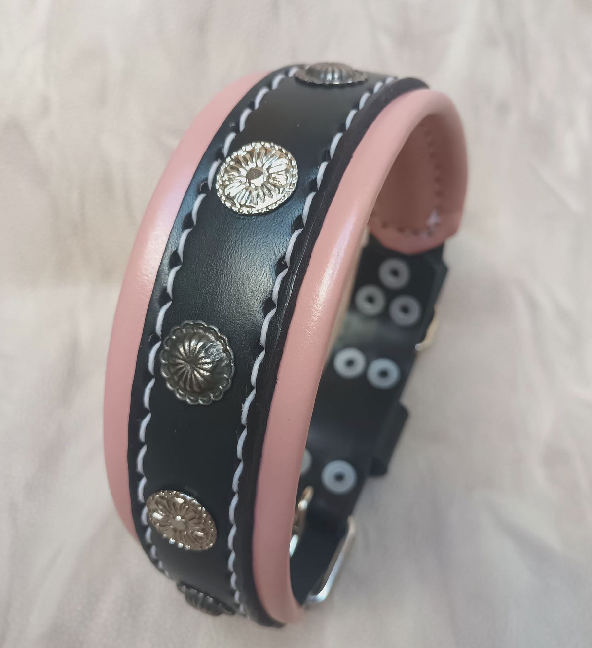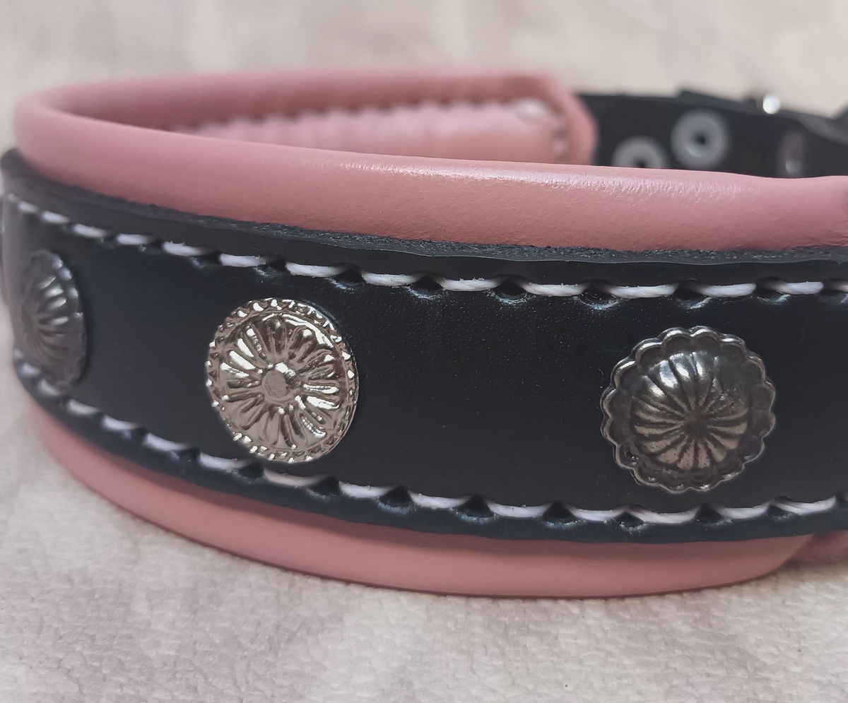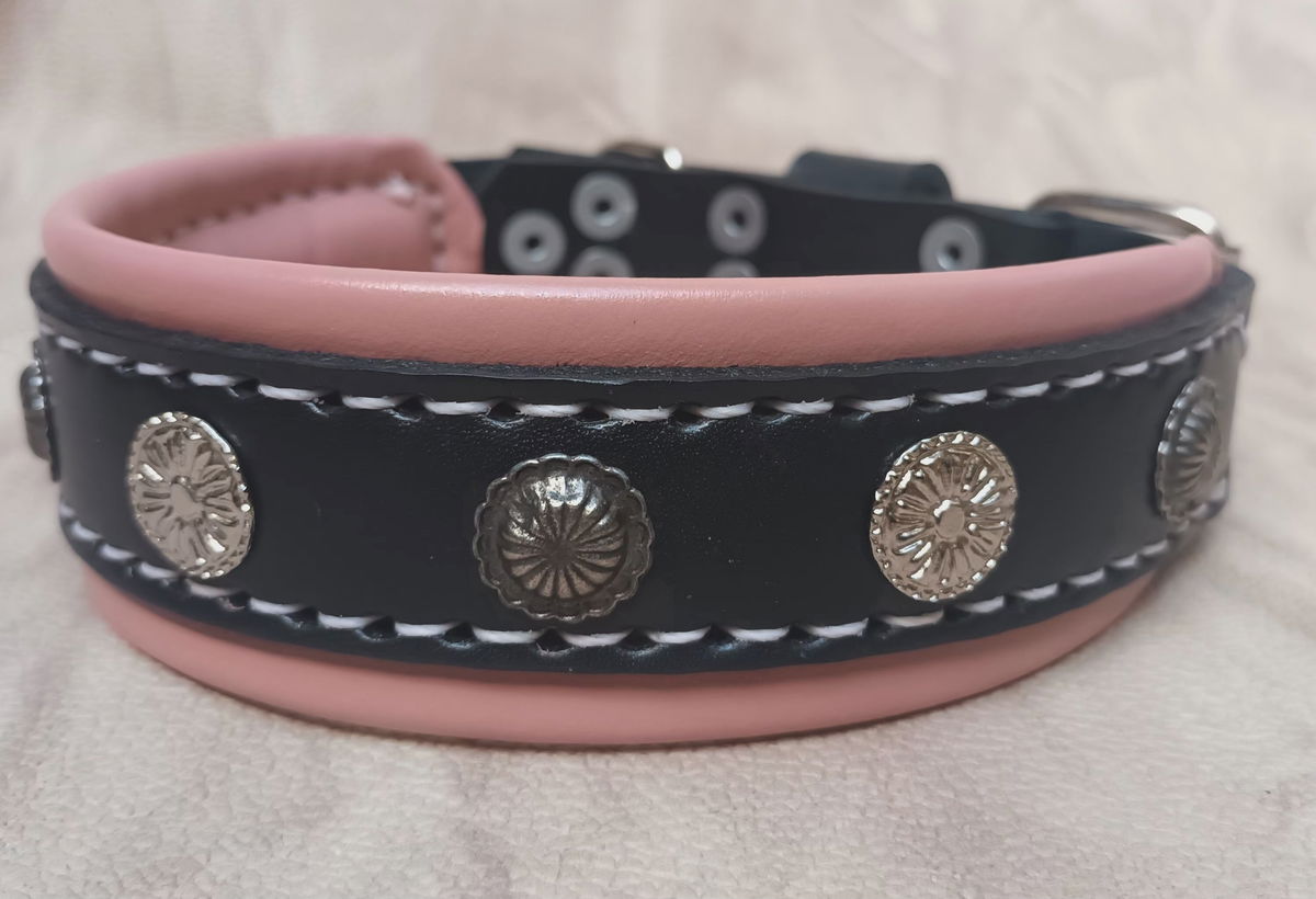 Collar especial en acolchado ultra soft rosa con cuero reforzado en negro totalmente cosido a mano, herrajes metálicos que pueden ser otros que más te gusten!